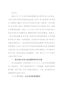 同志们:2022年7月7日是全民族抗战爆发85周年纪念日,85年前,中国人民经过艰苦卓绝的浴血奋战,打败了穷凶极恶的日本军国主义侵略者,赢得了近代以来中国反抗外敌入侵的第一次完全胜利。抗日战争,既是一场军事实力和经济实力的较量,更是一场意志和精神的较量。党的十八大