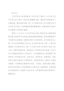 合,殷切寄语青年一代;出席庆祝中国共青团成立100周年大会并发表重要讲话;每逢五四、六一都以各种形式对青少年寄予期望、提出要求;给不同青少年群体回信勉励、谆谆教诲;先后同十七届、十八届团中央书记处集体谈话,对共青团和青少年工作提出一系列新观点新论断新要求……《论党的青年工作》一书
