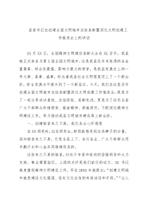 县委书记在创建全国文明城市总结表彰暨深化文明创建工作推进会上的讲话XX月XX日,全国精神文明建设表彰大会在XX召开,我县被正式命名为第X届全国文明城市。这是我县近年来取得的含金量最高、综合性最强、影响力最大的荣誉,是我县发展史上的一件大事、喜事、盛事,标