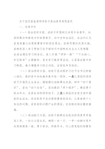关于县纪委监委领导班子政治素质表现鉴定一、总体评价(一)政治信仰方面。该班子牢固树立向党中央看齐、向党的理论和路线方针政策看齐、向中央和自治区、自治州以及县党委重大决策部署看齐的党性观念。坚持用理论武装头脑,坚持把深入学习贯彻习近