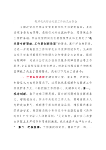 点,对政务性服务能力和统筹协调能力提出了很高要求。我有以下几点工作体会:一、注重革故鼎新在建设学习型、服务型、创新型、和谐型机关的总体要求下,必须把锐意创新作为提高工作实效的着力点,不断把握工作的核心、关键和未来。第一,观念创新。敢于
