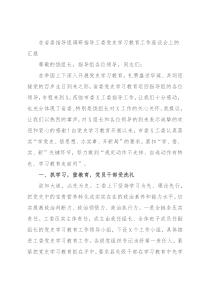 在省委指导组调研指导工委党史学习教育工作座谈会上的汇报尊敬的饶组长,指导组各位领导,同志们:在举国上下深入开展党史学习教育,礼赞盛世华诞、共同迎接党的百岁生日到来之际,省委党史学习教育巡回指导组的各位领导,专程来到X,莅临市委X工委指导工作,让我们十分感动,也充分体