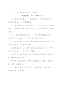 “一”字型有关排比句大全(40条)本期主题:“一”字型(九)1.一颗初心系人民,一马当先担使命,一刻不停强本领,一往无前抓落实,一尘不染强体魄。2.“择一事终一生”的执着专注,“干一行专一行”的精益求