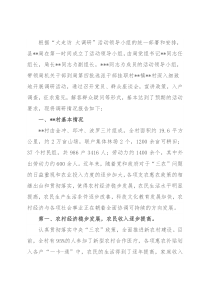 群众座谈会,宣讲政策,入户调查,征求意见,解答群众疑问等形式,基本达到了预期的活动要求,现将调研情况报告如下:一、**村基本情况**村由金冲、邱冲、波罗三片组成,全村面积约19.6平方公里,约2万亩山场,联户集体林场2个,1200余亩可耕田;37个村民组,共986户3416人;劳动力约
