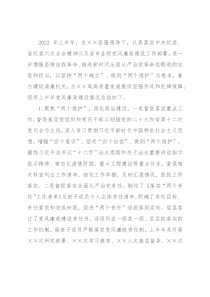 2022年上半年,在××坚强领导下,认真落实中央纪委、省纪委六次全会精神以及省市各级党风廉政建设工作部署,进一步增强坚持自我革命、推进新时代全面从严治党革命性锻造的自觉和担当,以坚持“两个确立”、做到“两个维护”为根
