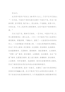 同志们:在庆祝中国共产党成立100周年大会上,习近平总书记指出:“一百年前,中国共产党的先驱们创建了中国共产党,形成了坚持真理、坚守理想,践行初心、担当使命,不怕牺牲、英勇斗争,对党忠诚、不负人民的伟大建党精神,这是中国共产党的精神之源。”历史川流不息,精神代代相传。一百年来,中国共产党