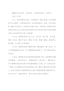 尊敬的各位来宾、各位家长,亲爱的老师们、同学们:大家上午好!今天,我们相聚在这里,为普通高中2022届高三学生隆重举行毕业典礼,共享桃李芬芳,共话离别眷恋。首先,我代表学校4000多名师生,向顺利完成高中学业、即将跨入高等学府深造的全体毕业生们表示热烈的祝贺!向为同学们的成长倾注智慧和爱心