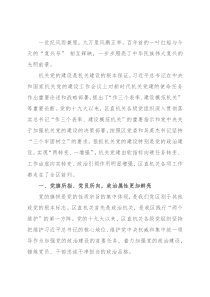 作三个表率、建设模范机关”等重要论断。党的十九大以来,区直机关各级党组织深入贯彻落实总书记“作三个表率、建设模范机关”的重要指示和党中央关于加强机关党的建设的决策部署,按照区党委和吴英杰书记坚持“三个牢固树立”