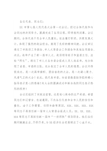 各位代表、同志们:XX市第七届人民代表大会第一次会议,经过全体代表和与会同志的共同努力,圆满完成了各项议程,即将胜利闭幕。会议期间,全体代表不负全市人民重托,依法履行职责,共商发展大计,体现了强烈的政治担当,展现了良好的精神风貌。