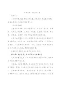 专题党课:初心的力量同志们:今天的党课,题目是初心的力量。讲课之前,我先提个问题,有谁知道我党的创始人都有哪几位?(互动环节略)大家来看大屏幕:他们分别是李达、李汉俊、董必武、陈潭秋、毛泽东、何叔衡、王尽美、邓恩铭、张国焘、刘仁静、陈公博、周佛海、包惠僧,还有列席会议的两位苏