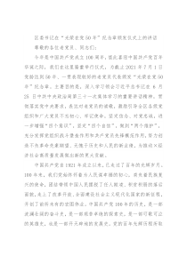 区委书记在“光荣在党50年”纪念章颁发仪式上的讲话尊敬的各位老党员、同志们:今年是中国共产党成立100周年,值此喜迎中国共产党百年华诞之际,我们在这里隆重举行仪式,为截止2021年7月1日党龄达到50年、一贯表现较好的老党员代表颁发“光荣在党50年”纪念章。主要