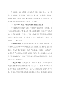 今年以来,XX以创建文明单位为契机,以文化人、以文育人、以文励人,持续建设“讲政治、重公道、业务精、作风好”的模范部门,着力打造忠诚干净担当的高素质XX干部队伍,努力在推动良好政治生态上走在前、作贡献。一、以“学”为先,锻造对党忠诚的政