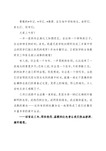 尊敬的*书记、*书记、*教授、各位初中学校校长,老师们、家长们、同学们:大家上午好!一年一度的毕业典礼又如期而至,在这样一个特殊的日子,在这样神圣的时刻,首先,我谨代表学校向顺利完成三年高中学业的同学们致以热烈的祝贺!并向辛勤付出、日夜陪伴的全体教职员工和家长致以诚挚的谢意!有人说,毕