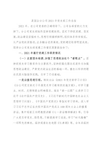 某国企分公司2021年党支部工作总结2021年,在公司党委的正确领导下,公司各部室的大力支持下,分公司党支部始终坚持党建统领,坚定不移抓党建、促发展,政治建设坚强有力,思想引领旗帜鲜明,组织体系科学规范,