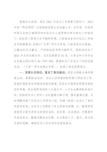 情况,军地领导及时会商研究,由区人武部主要领导及时前往处置,防止沟通不畅被退兵。虽然我区在2021年征兵工作中取得了一定的成绩,但还存在兵源潜力挖掘不够、破解瓶颈办法不多等问题。在下一步工作中,我区将广泛学习兄弟区县的成功经验,认真研究解决“两征两退”兵役政策调整改革中的新情况