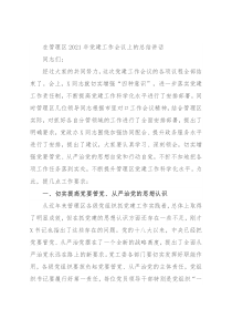 在管理区2021年党建工作会议上的总结讲话同志们:经过大家的共同努力,这次党建工作会议的各项议程全部结束了。会上,X同志就切实增强“四种意识”,进一步落实党建工作责任制,不断提高党建工作科学化水平进行了安排部署,同时管理