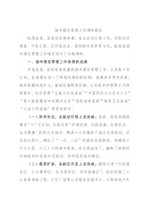 城市建设管理工作调研报告按照县委、县政府安排部署,结合自身分管工作,采取走访调查、听取汇报、召开座谈会、查阅相关资料等方式,就我县城市建设管理工作情况进行了专题调研。一、城市建设管理工作取得的成绩历届县委、县政府高度