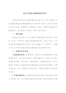 2022年度党风廉政建设责任书为更好贯彻落实党风廉政建设责任制,进一步加大集团公司党风廉政建设和反腐倡廉建设工作的领导力度和工作力度,落实全面从严治党,持续推进“清廉国企”建设。按照党风廉政责任制的要求,结合集团公司实际,特签订本责任书。一、责任范围所属企业党支部(总支)