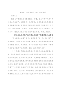 ,最后,我要强调的是“我为群众办实事”不是一个活动,更不是一阵风、搞形式、走过场,而是要通过这个契机,切实锤炼党性,牢记宗旨意识,进一步密切与群众的联系,在为民办成一件件小事的过程中实现自身的价值,形成长效机
