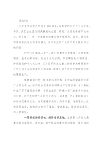 同志们:今年是中国共产党成立101周年,也是党的二十大召开之年。今天,我们在这里共同庆祝党的生日,激励广大党员干部不忘初心,担当实干,进一步发挥先锋模范和表率作用。首先,我代表市委向奋战在全市各条战线、各行各业的广大共产党员致以节日的问候