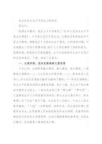在全区安全生产月度会上的讲话同志们:按照省市要求,我区X月中旬制定了《X市X区安全生产月度会议制度》,今天我们召开月度会议,主要任务是贯彻省市月度会议精神,通报我区X月度安全生产情况,分析查找问题,对近期重点工作进行部署安排。刚才X、