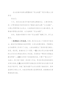 在全县城市创新治理暨推进“民生地图”项目专题会上的讲话同志们:今天,我们在这里召开城市创新治理推进会,主要目的是:进一步贯彻落实市委市政府关于精细化城市治理“五五战略”,以群众所需所盼为出发点,以创新城市发展方式为基本路径,统筹城市管理各类资源,全力绘制好“民生地图”。首先,我就如