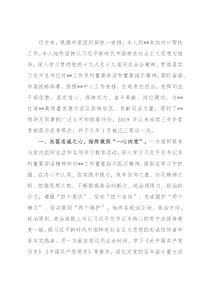 持以习近平新时代中国特色社会主义思想为指导,深入学习贯彻党的十九大及十九届历次全会精神,贯彻落实省第**次党代会精神及省市有关会议精神,以省委、市委战略部署为统揽和遵循,按照上级工作安排,立足本职岗位,坚定理想信念,牢记初心使命,矢志拼搏奋斗,勇毅前
