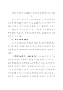 区统计局党支部书记2021年度书记抓基层党建工作述职报告2021年,在区机关工委的正确领导下,区统计局党支部认真学习贯彻党的十九届六中全会会议精神,以习近平新时代中国特色社会主义思想为指导,紧紧围绕全市“高质发展、后发先至”主题主线,按区委区政府“X”工作部署,团结带领