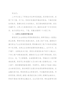 同志们:上半年全省上下积极应对各种风险挑战,经济稳定向好,实现了开门稳、开门红,但经济发展的环境依然复杂,不确定因素依然较多,稳增长的压力依然较大。我们要准确把控形势,抓住关键环节,以更大力度做好经济工作,确保完成第下半年目标任务,奋力实