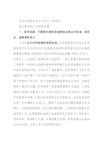 在全市城管执法工作会议上的讲话我主要讲四个方面的问题:一、肯定成绩,不断提升新阶段城管执法事业开好局、起好步、谋新篇的信心(一)全力打好疫情防控阻击战。全市城管执法系统认真贯彻落实习近平总书记关于统筹推进疫情防控和