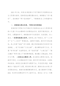 2021年以来,市委XX部坚持以习近平新时代中国特色社会主义思想为指导,坚持把政治建设摆在首位,持续强化“四个意识”,坚决做到“两个坚决维护”,不断提高XX工作质量和水平。一、持续强化理论武装,不断夯实思想根基坚持把学习贯彻习近平新时代中国特色