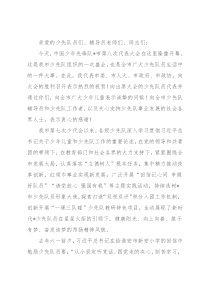 时代和煦的阳光下,肩负着建设祖国美好明天的重任,要牢记习爷爷的教诲,牢记党和人民的期待,沿着星星火炬指引的方向茁壮成长,为*建设社会主义现代化强市接续奋斗,为实现中华民族伟大复兴的中国梦时刻准备着!最后,预祝*市第八次少代会圆满成功!