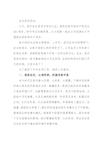 志的付出,在此,我代表党支部向一直辛勤奋战在公司各条线、各岗位的同志们致以节日的问候,大家辛苦了!为了做好下半年各项工作,我讲三点意见:一、提高站位、认清形势,把握发展节奏当今时代正经历着大发展、大变革、大