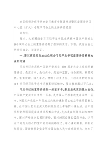 在区级领导班子党史学习教育专题读书班暨区委理论学习中心组(扩大)专题学习会上的主持讲话提纲同志们:刚才,大家围绕学习习近平总书记在庆祝中国共产党成立100周年大会上的重要讲话做了很好的发言,下面,我结合自己的学习体会,谈