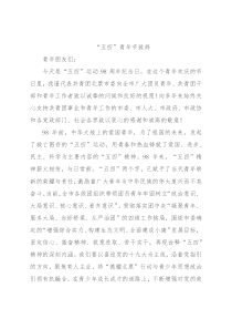 “五四”青年节致辞青年朋友们:今天是“五四”运动98周年纪念日。在这个青年欢庆的节日里,我谨代表共青团北票市委向全市广大团员青年、共青团干部和青年工作者致以诚挚的问候和良好的祝愿!向多年来始终关心支持共青团事业和青年工作的市委、市人大、市政府、市政协和各党政部门、社会