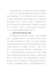 心、担责于身、履责于行,聚焦组织部门主责主业,推动全面从严治党向纵深发展、向基层延伸,较好地落实了“一岗双责”、完成了上半年既定目标任务。现将2021年上半年本人履行职责和廉洁自律情况报告如下。一、坚持用党的科学理论凝心铸魂始终把强化学习作为提升素质、转变角色、做好工作的重要途径。一