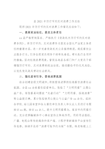 县2021年厉行节约反对浪费工作总结现将2021年厉行节约反对浪费工作情况总结如下:一、提高政治站位,落实主体责任xx县严格贯彻落实、严格执行《党政机关厉行节约反对浪费条例》,将厉行节约、反对浪费作为落实全面从严治党主