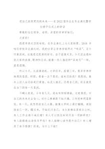 把自己放到更远的未来——在2022届毕业生毕业典礼暨学位授予仪式上的讲话尊敬的各位领导、老师,亲爱的学弟学妹们:大家好!很荣幸再次回到母校,在毕业典礼上与大家相聚。2018年咱们学校毕业典礼时,我的分享让学弟学妹两次“哄笑”,至今印象深刻,这就是近距离的好处。由于疫情关系,今天