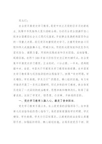 同志们:在全党开展党史学习教育,是党中央立足党的百年历史新起点、统筹中华民族伟大复兴战略全局,为动员全党全国满怀信心投身全面建设社会主义现代化国家,开创事业发展新局面而作出的一项重大决策。我们党历来重视党史学习,注重用党的奋斗历程和伟大成就鼓舞斗志、明确方