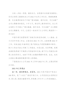 致以最诚挚的敬意和衷心的感谢。下面我结合X公司2021年工作和2022年工作,主要谈两部分内容。2021年工作亮点这一年,我们学党史,庆百年。2021年是中国共产党成立100周年,是“十四五”规划开局之年