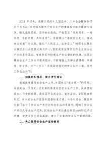 2021年以来,我镇以党的十九届五中、六中全会精神和习近平总书记、李克强总理关于安全生产的重要指示批示精神为指导,强化底线思维、坚守安全底线,严格落实“党政同责、一岗双责、齐抓共管、失职追责”,将继续以“落实安全责任、推动安全发展