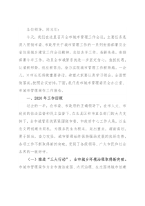 一会儿,×市长还将做重要讲话,希望大家要认真学习领会,全面贯彻落实。按照会议安排,下面,我代表市城市管理委员会办公室、市城市管理局作工作报告。一、2020年工作回顾过去的一年,在市委、市政府的正确领导下,在市人大、市政协的依法监