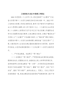 工信局机关2022年党建工作要点2022年是党的二十大召开之年,是攻坚推进“工业强市”行动,奋力实现市第十二次党代会确定目标任务的关键一年。2022年市工信局机关党建工作的总体要求是:高举习近平新时代中国特色社会主义思想伟大旗帜,深入学习党的十九