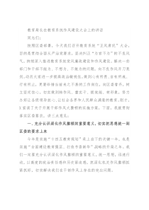 教育局长在教育系统作风建设大会上的讲话同志们:按照区委部署,今天我们召开教育系统“正风肃纪”大会,目的是贯彻全面从严治党要求,坚决纠正“为官不为”的不良风气,持续深入推进教育系统党风廉政建设和作风建设。解决一些部门和干部不能为、不想为、不敢为的问题,向不良作风开刀亮剑。动员大家进一步提高