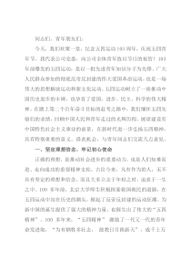 同志们、青年朋友们:今天,我们欢聚一堂,纪念五四运动103周年,庆祝五四青年节。我代表公司党委,向公司全体青年致以节日的祝贺!103年前爆发的五四运动,是以一批先进青年知识分子为先锋、广大人民群众参加的彻底反帝反封建的伟大爱国革命运动,也是