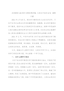 庆祝建党100周年专题党课讲稿:从党史中坚定自信、凝聚力量2021年2月20日,党史学习教育动员大会在北京召开。习近平总书记出席会议并发表重要讲话。他强调,在全党开展党史学习教育,是党中央立足党的百年历史新起点、统筹中华民族伟大复兴战略全局和世界百年未有之大变局、为动员全党全国