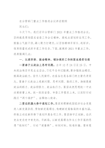 在分管部门重点工作推进会议讲话提纲同志们:今天下午,我们召开分管部门2021年重点工作推进会议,目的就是贯彻落实省委工作会议精神,高起点谋划好各项工作,提振士气鼓干劲,凝心聚力打硬仗,以百倍精神开好头、起