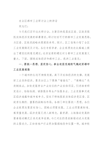 在全区都市工业研讨会上的讲话同志们:今天我们召开这次研讨会,主要目的是落实区委、区政府狠抓实体经济发展的部署要求,研讨切实可行的都市工业发展思路,为区委、区政府战略决策提供参考。刚才,区工信局介绍了全区工业发展情况及计划,各