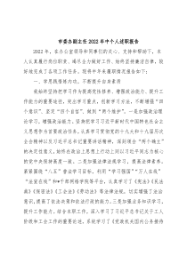 市委办副主任2022年中个人述职报告2022年,在办公室领导和同事们的关心、支持和帮助下,本人认真履行岗位职责、竭尽全力做好工作、始终坚持廉洁自律,较好地完成了各项工作任务。现将半年来履职情况报告如下:一、学思践悟练内功,不断提升自身素质我始终坚持把学习作为提高党性修养、增强政治能力、提升工作