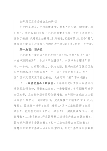 在开发区工作务虚会上的讲话今天的务虚会,主题非常清楚,就是“回头望、向前看、再出发”。刚才各部门汇报了上半年的重点工作,并对下半年的工作作了安排,我感觉总结精炼,思路精准,汇报精简,这三个“精”,要成为开